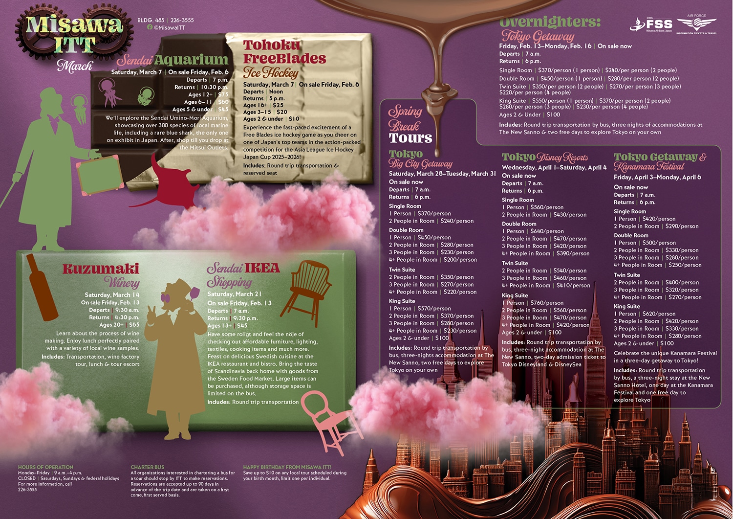 To book any of our tours, visit Misawa ITT in BLDG. 485 or call 226.3555 (DSN) or 0176.77.3555 (cell)